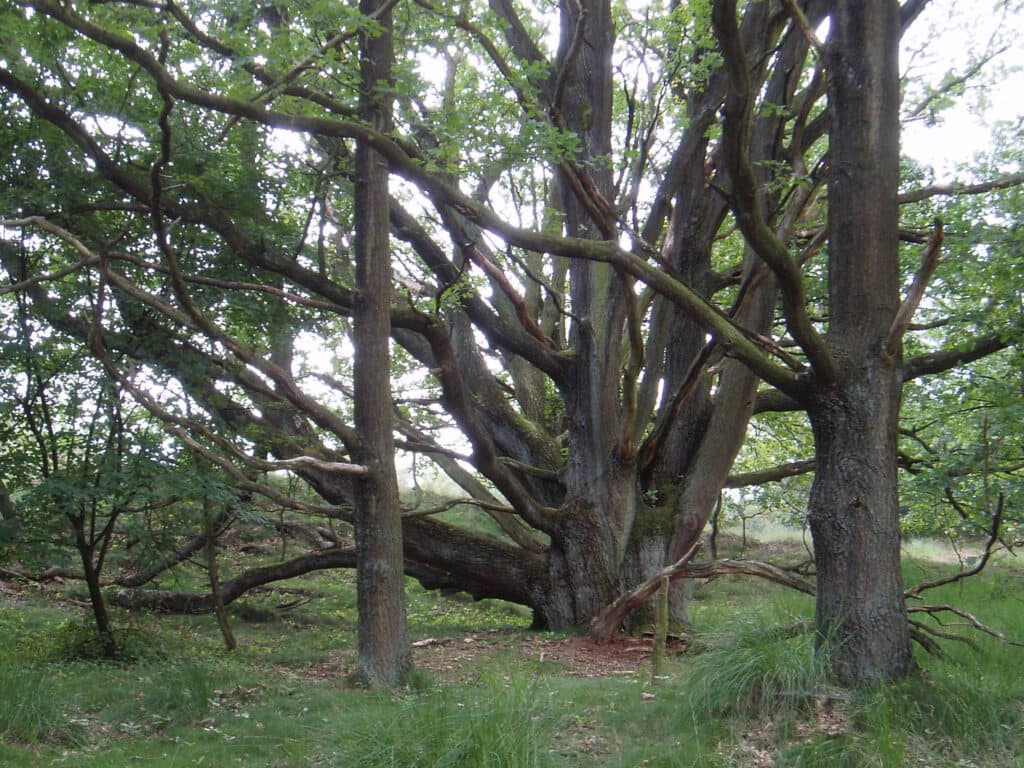 Dan de Drunense Duinen als geheel In de Drunense Duinen staan een groot aantal oude, ondergestoven eiken die er nu uitzien als zandheuvels met kreupelhout. Deze bomen behoren tot de oudste bomen van ons land.