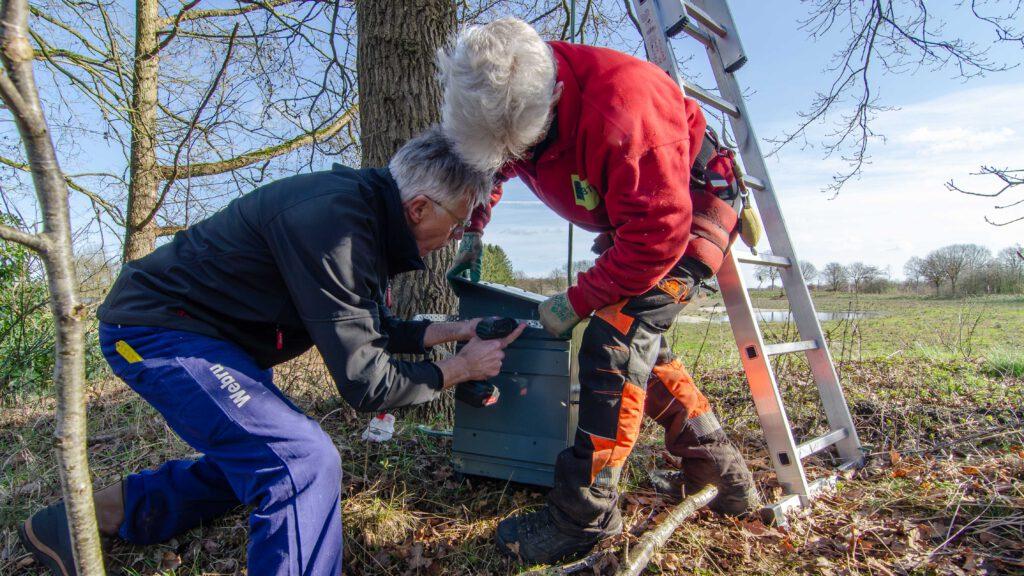 Maar goed de kast was aan een update toe. Hans heeft de kast gerepareerd en Bert heeft de kast weer een mooi kleurtje gegeven. Aan de oostkant van de grote poel werd een mooi plekje gevonden.